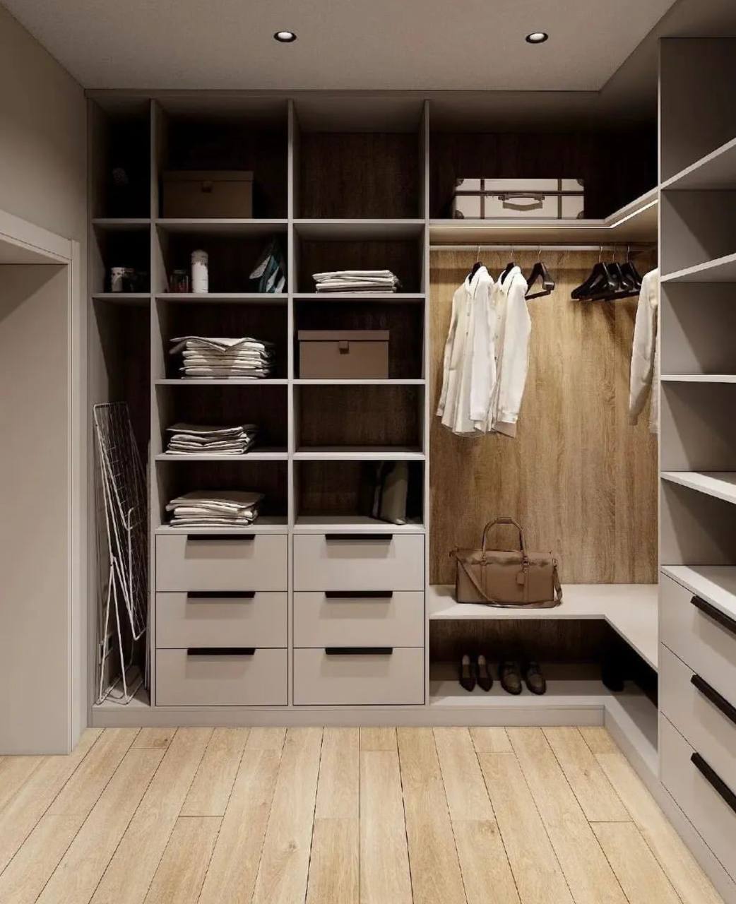 Закрытый шкаф в этой гардеробной только один. Три другие секции — открытого типа, поэтому имеющаяся площадь используется более эффективно.