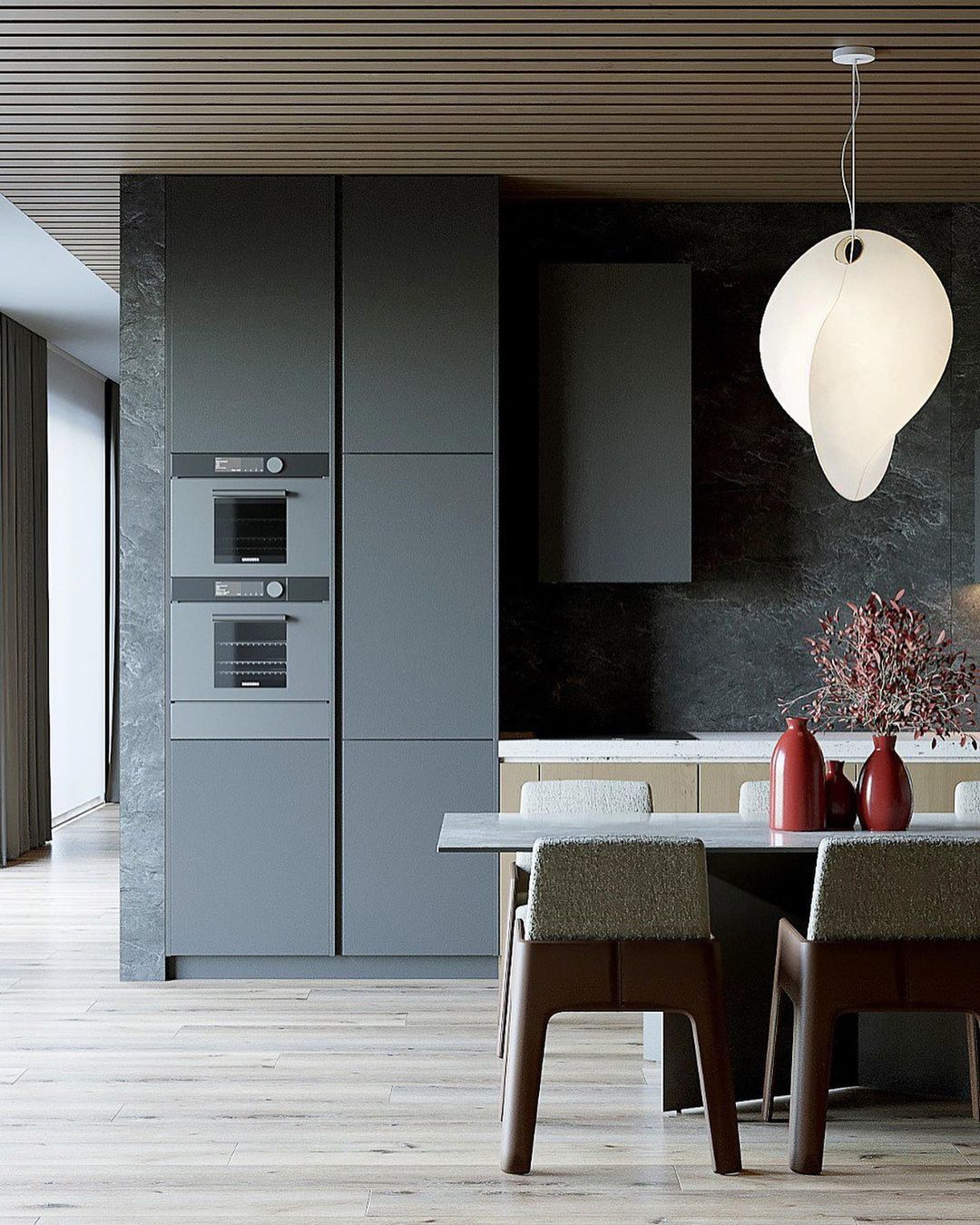Кухонный гарнитур Norma прямой конфигурации занимает всю длину стены и имеет встроенные колонки с техникой. Кухня получилась очень функциональной и компактной. Высокие верхние шкафчики предназначены для посуды и кухонных аксессуаров.