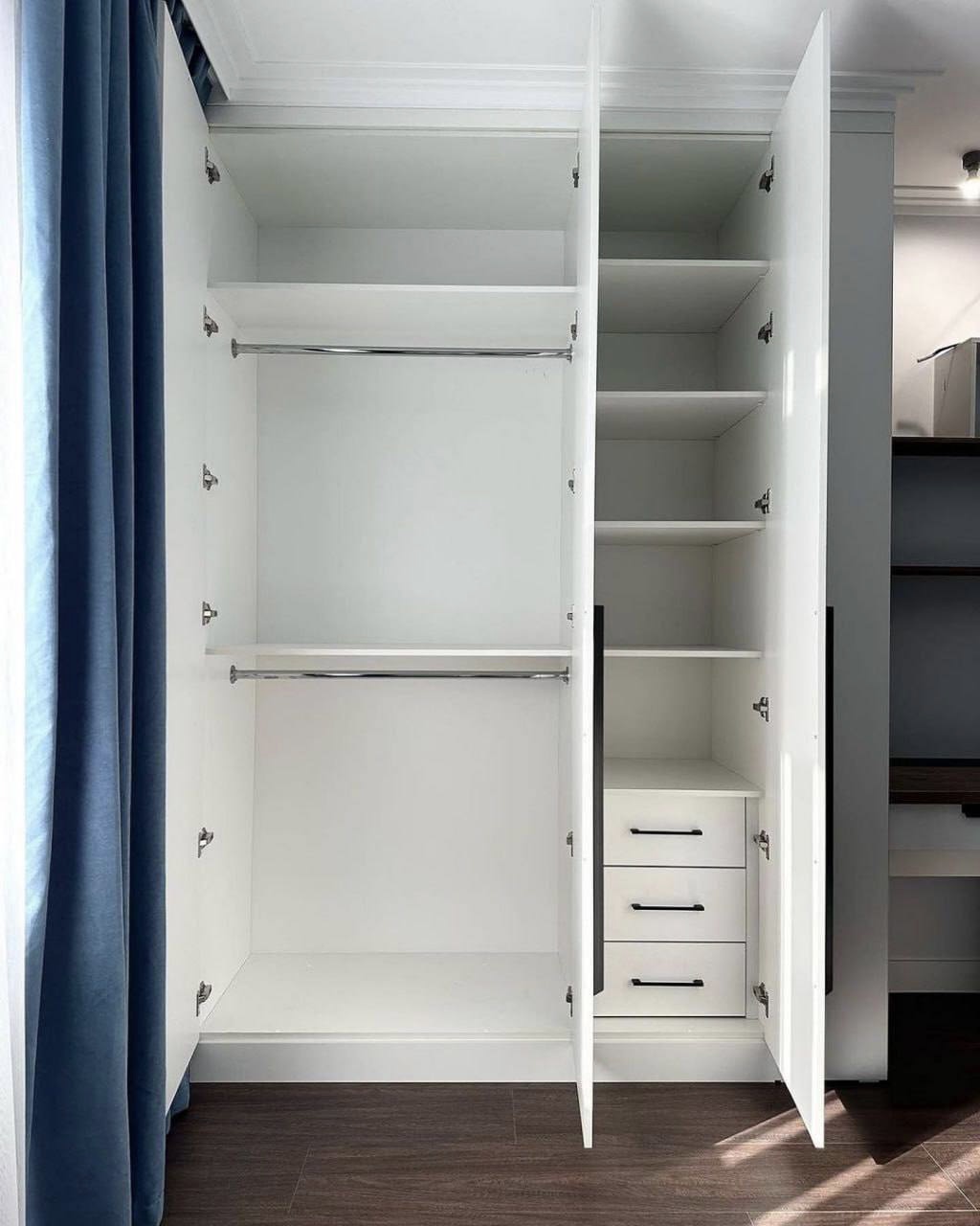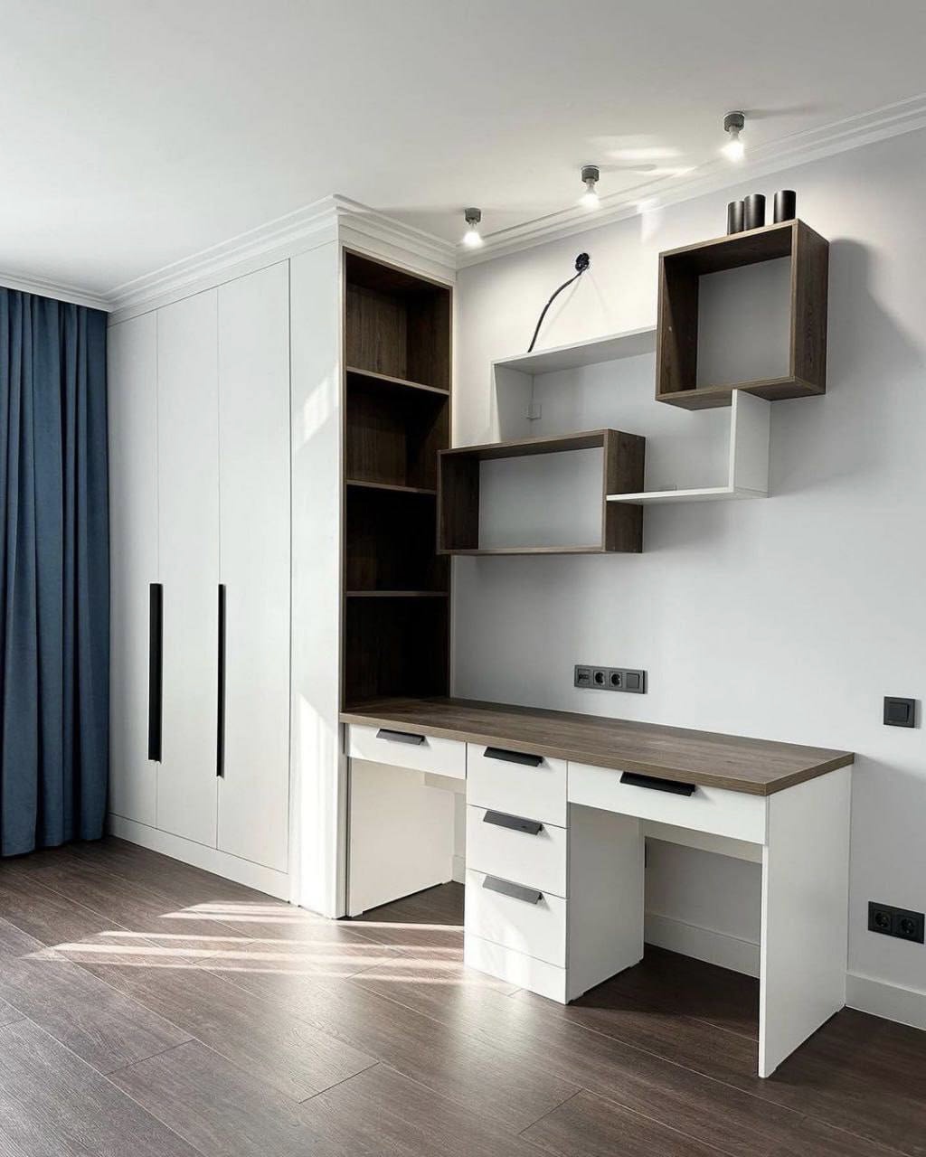 Большой шкаф для хранения вещей и рабочий стол в светлых оттенках не перегружает пространство.