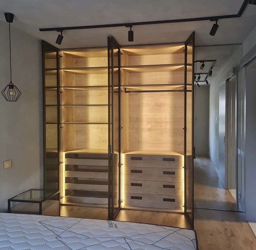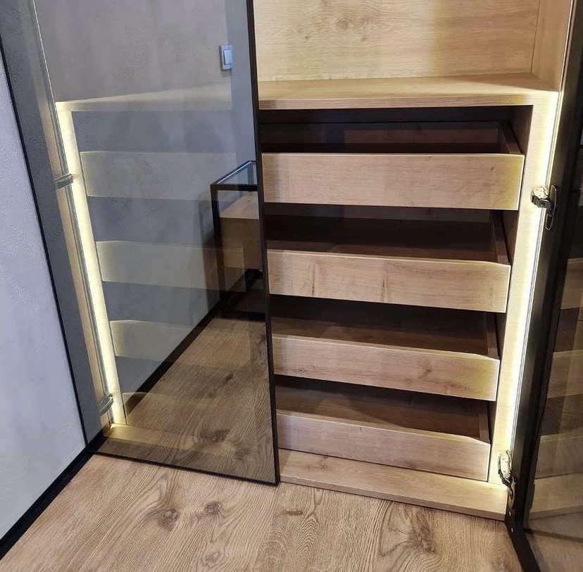 При оформлении фасадов распашного шкафа, стеклянные фасады пользуются широкой популярностью. И это очень легко объяснить – в небольшом помещении они работают на зрительное «расширение» пространства и за счет отражения способны дополнительно «подсветить» комнату с недостаточной освещенностью.