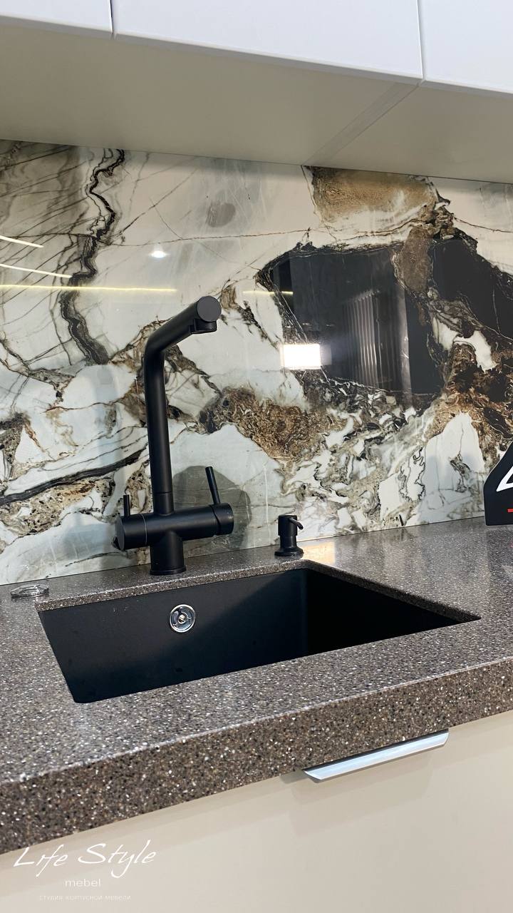 Представляем вам кухонный гарнитур в белом и бежевом цвете с мраморной столешницей в коричневых тонах. Эта кухня является идеальным решением для тех, кто стремится к современному и элегантному интерьеру.