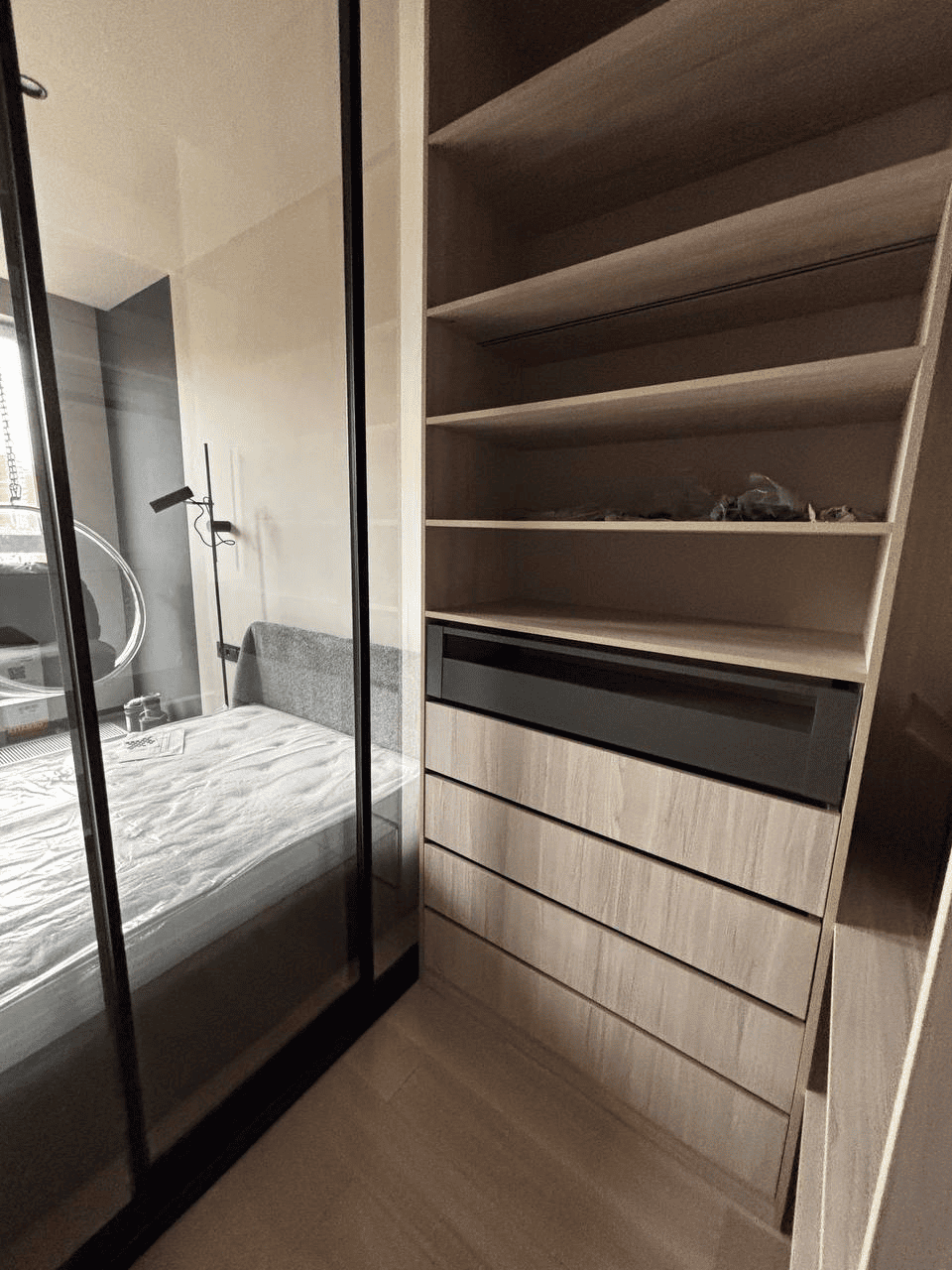 Стеклянные фасады визуально расширяют пространство, чёткая геометрия добавляет интерьеру статус, а продуманное наполнение делает хранение удобным и логичным! Такая гардеробная не утяжеляет интерьер, а наоборот — становится его стильным акцентом и функциональной частью спальни.