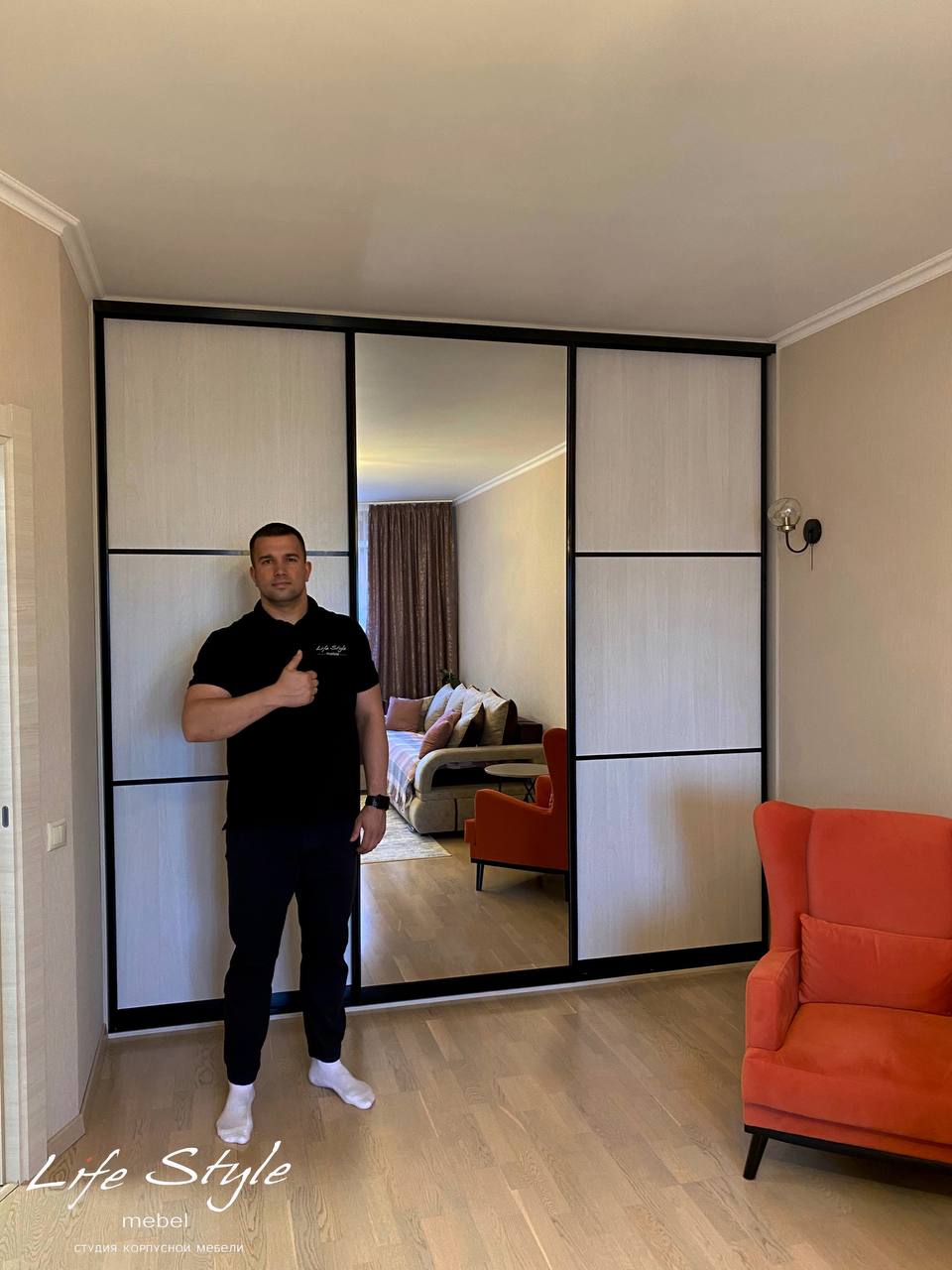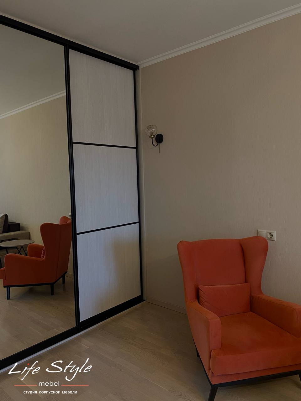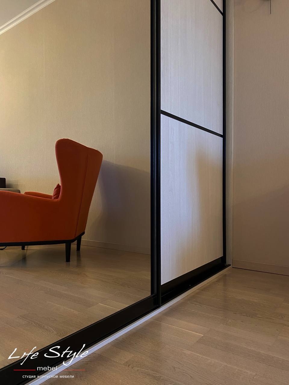 Одна из дверей шкафа выполнена из зеркала, что делает его еще более практичным и удобным. Зеркало помогает вам проверить свой образ перед выходом из дома, а также визуально расширяет пространство в комнате. Зеркальная поверхность отражает свет, что создает светлую и просторную атмосферу.