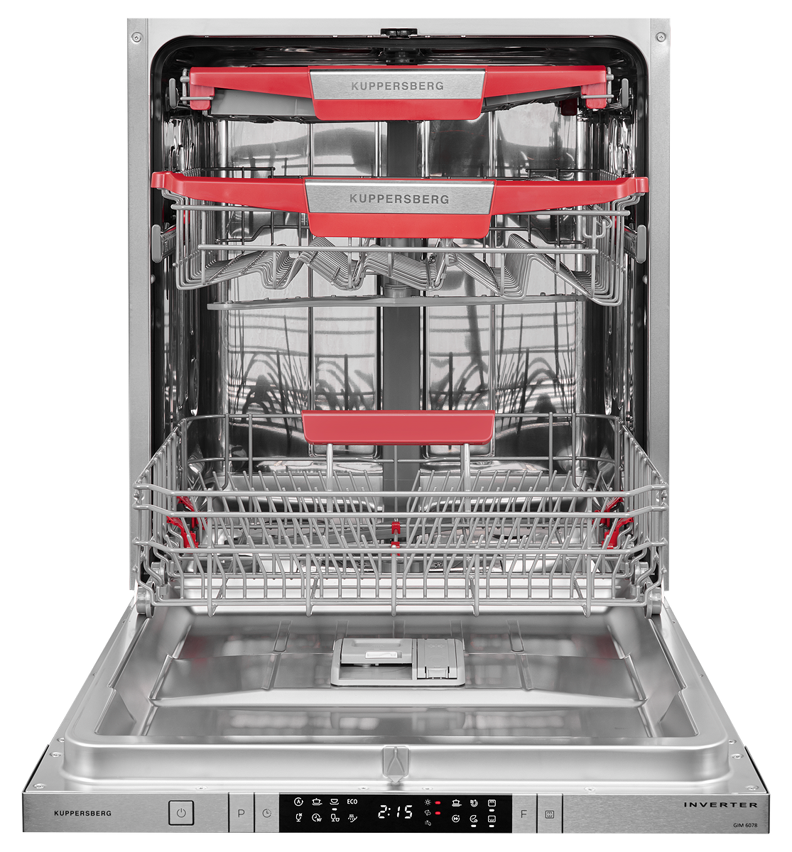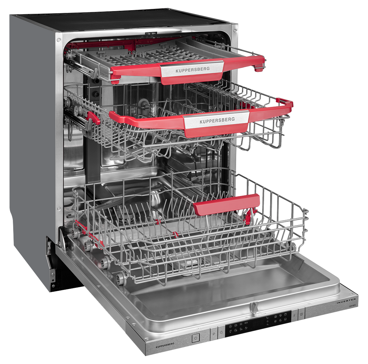 Выбрать нужный режим и другие настройки можно при помощи удобной сенсорной панели, которая надежно защищена от загрязнений и прослужит долго. Кроме того, модель оснащена функцией луча на полу, который подскажет, когда устройство закончит цикл мытья и из него можно будет безопасно извлекать чистую посуду.