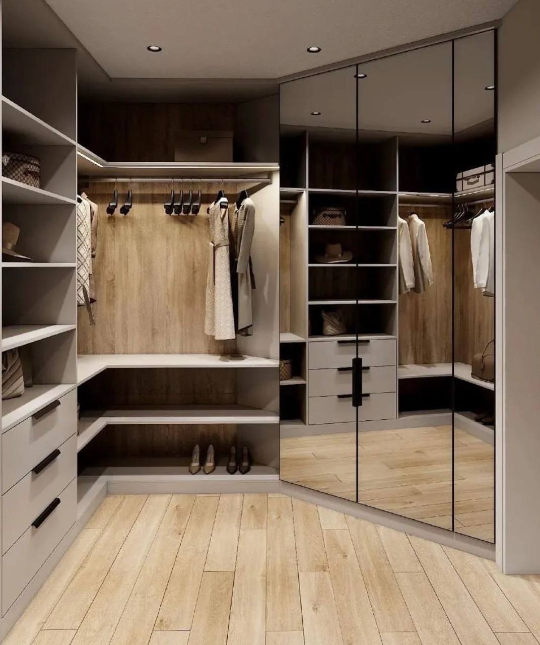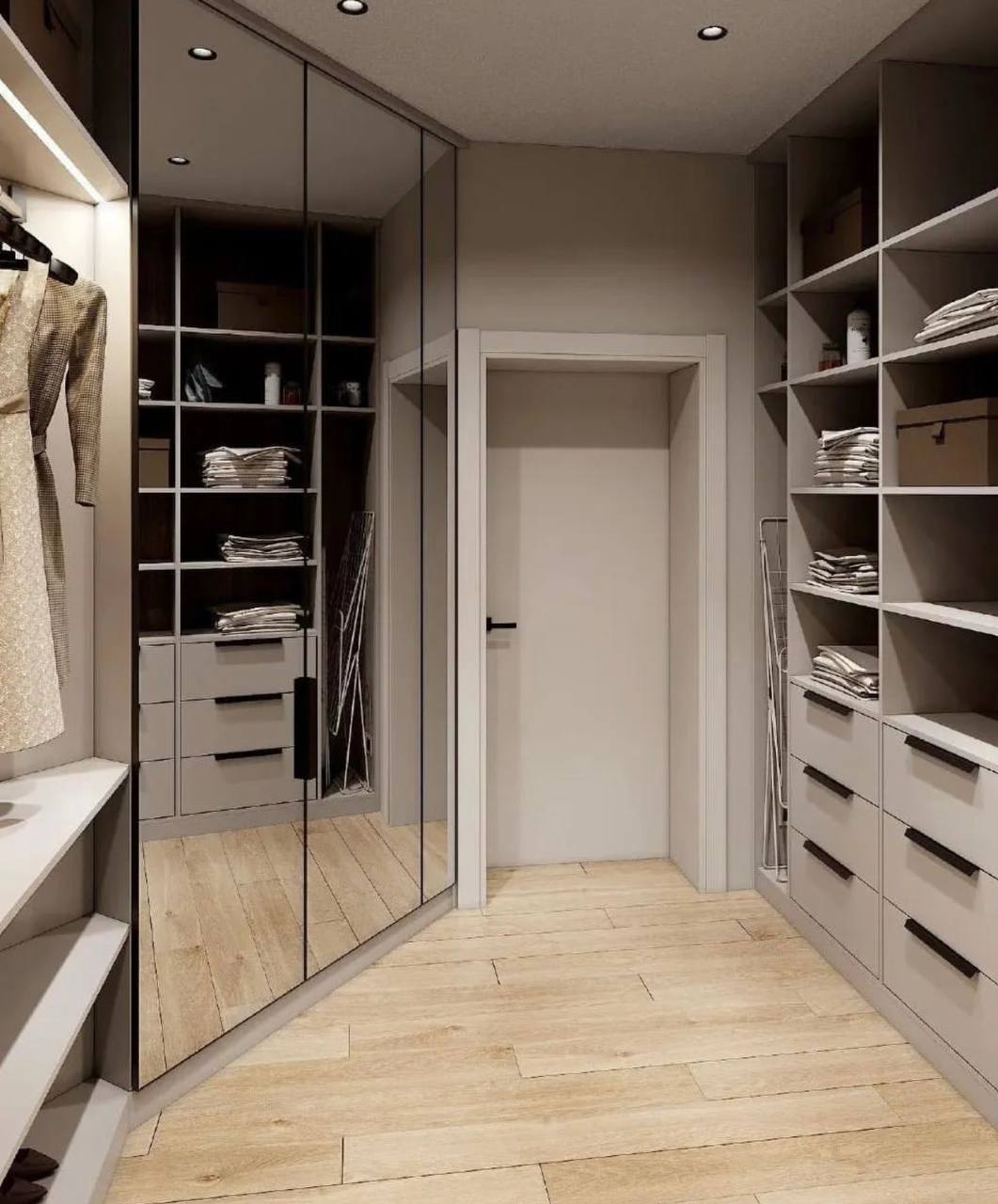Небольшая гардеробная для компактной выделенной комнаты оснащена распашными дверьми с зеркальными фасадами. Это сделано для того, чтобы визуально расширить скромное пространство, добавить в помещение больше света. С той же целью установлена светодиодная подсветка.