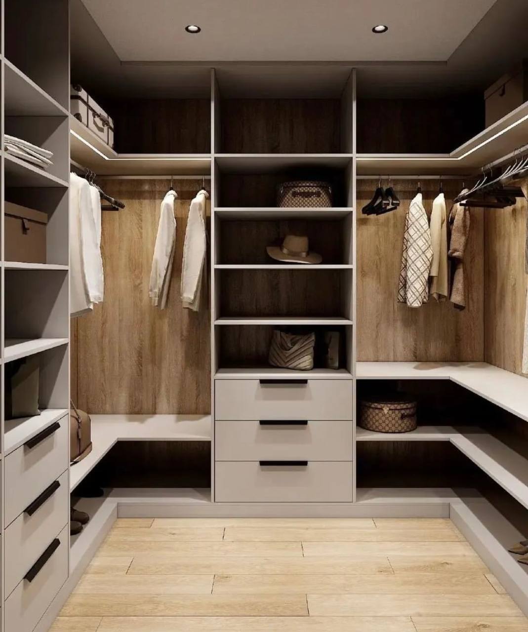 Закрытый шкаф в этой гардеробной только один. Три другие секции — открытого типа, поэтому имеющаяся площадь используется более эффективно.