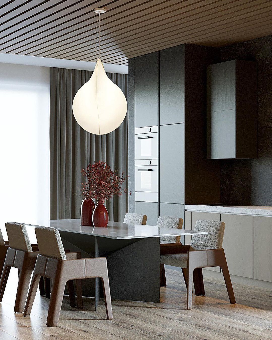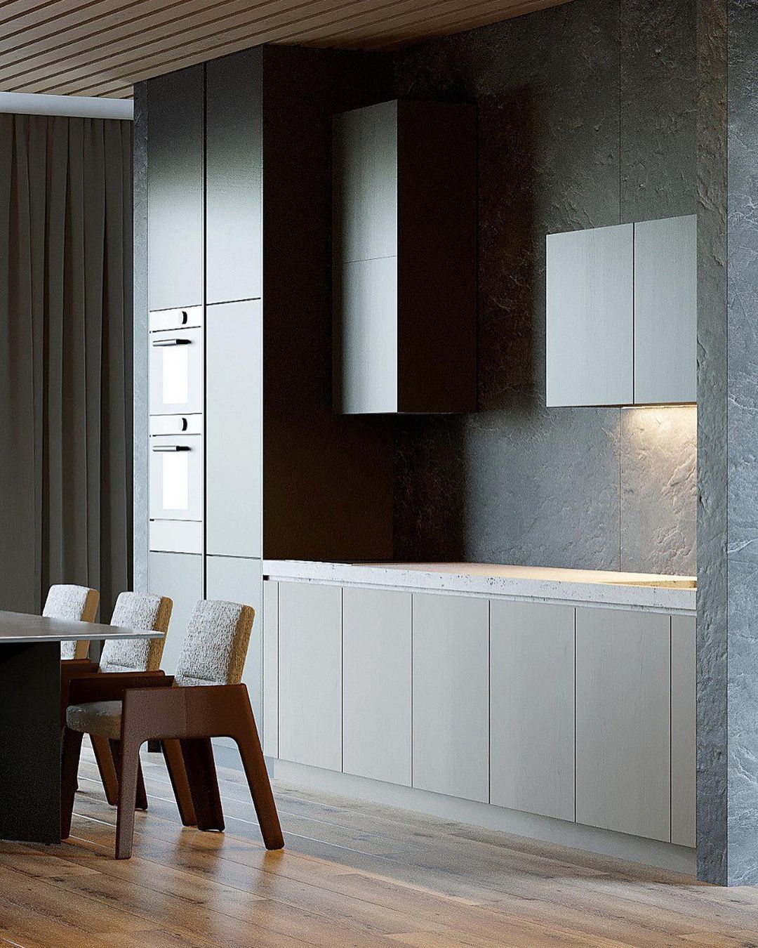 Кухонный гарнитур Norma прямой конфигурации занимает всю длину стены и имеет встроенные колонки с техникой. Кухня получилась очень функциональной и компактной. Высокие верхние шкафчики предназначены для посуды и кухонных аксессуаров.