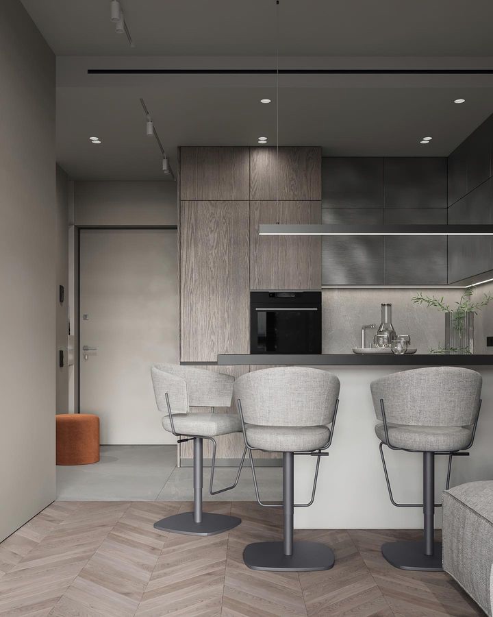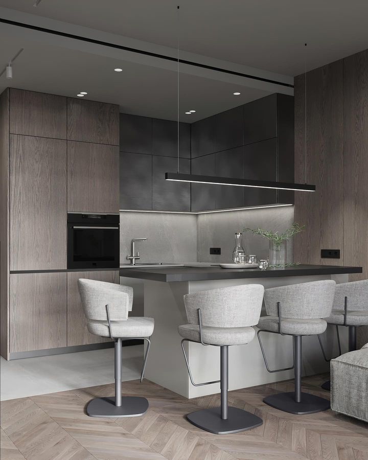 Геометричные формы этой модели сопровождает минимальное число деталей. Глухие фасады могут закрывать сразу несколько внутренних ящиков. Фактурные фасады, холодный металл и сдержанные цвета — стиль минимализм воплощает в себе самые современные тенденции в дизайне кухонь.