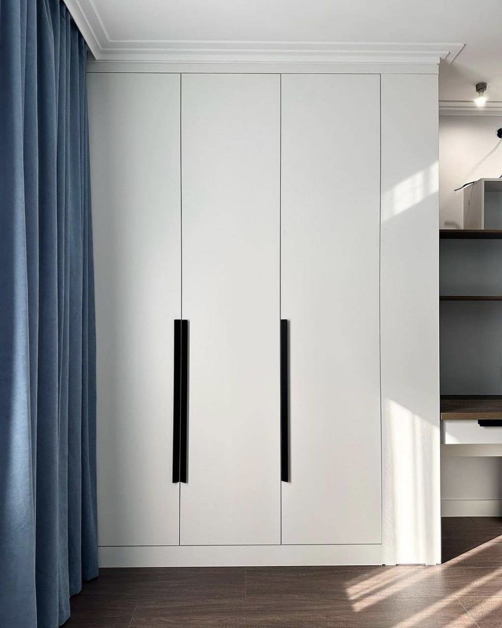 Большой шкаф для хранения вещей и рабочий стол в светлых оттенках не перегружает пространство.