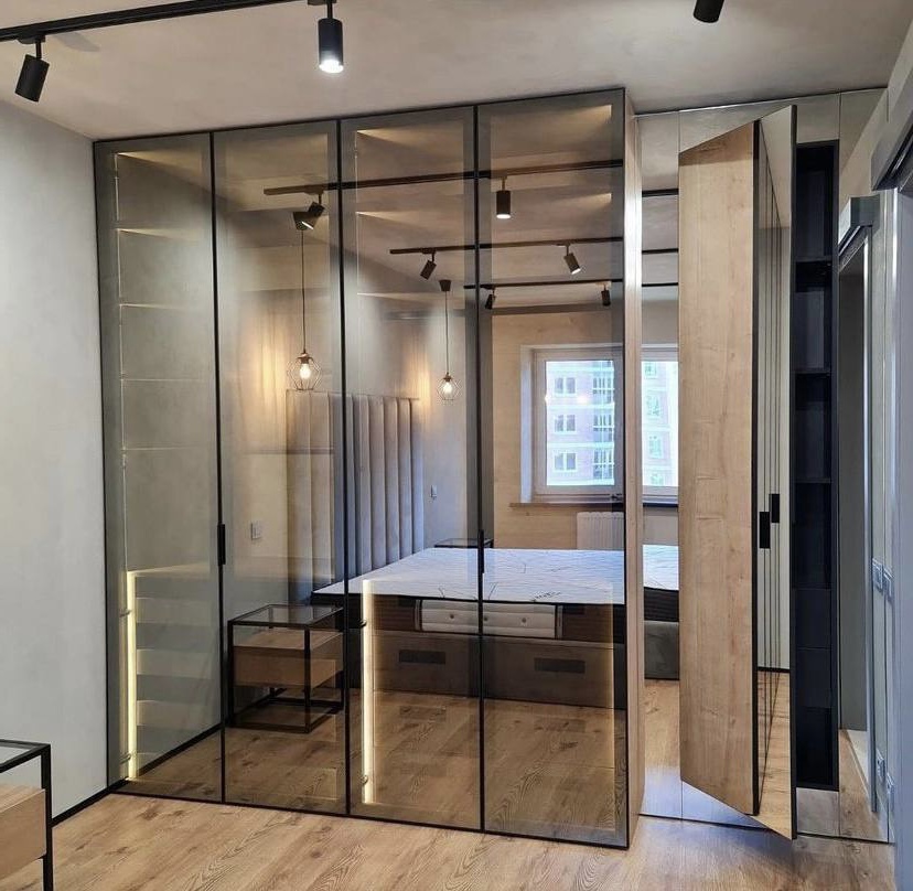 При оформлении фасадов распашного шкафа, стеклянные фасады пользуются широкой популярностью. И это очень легко объяснить – в небольшом помещении они работают на зрительное «расширение» пространства и за счет отражения способны дополнительно «подсветить» комнату с недостаточной освещенностью.