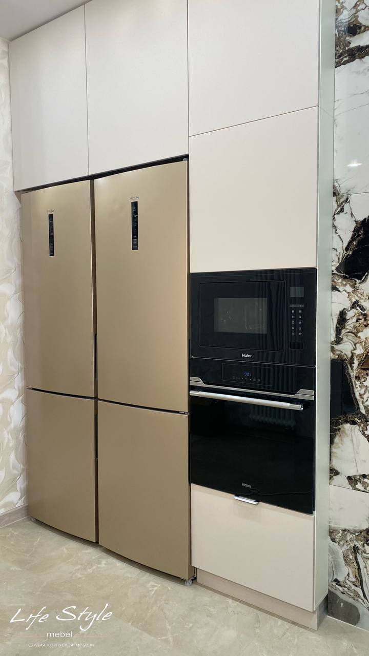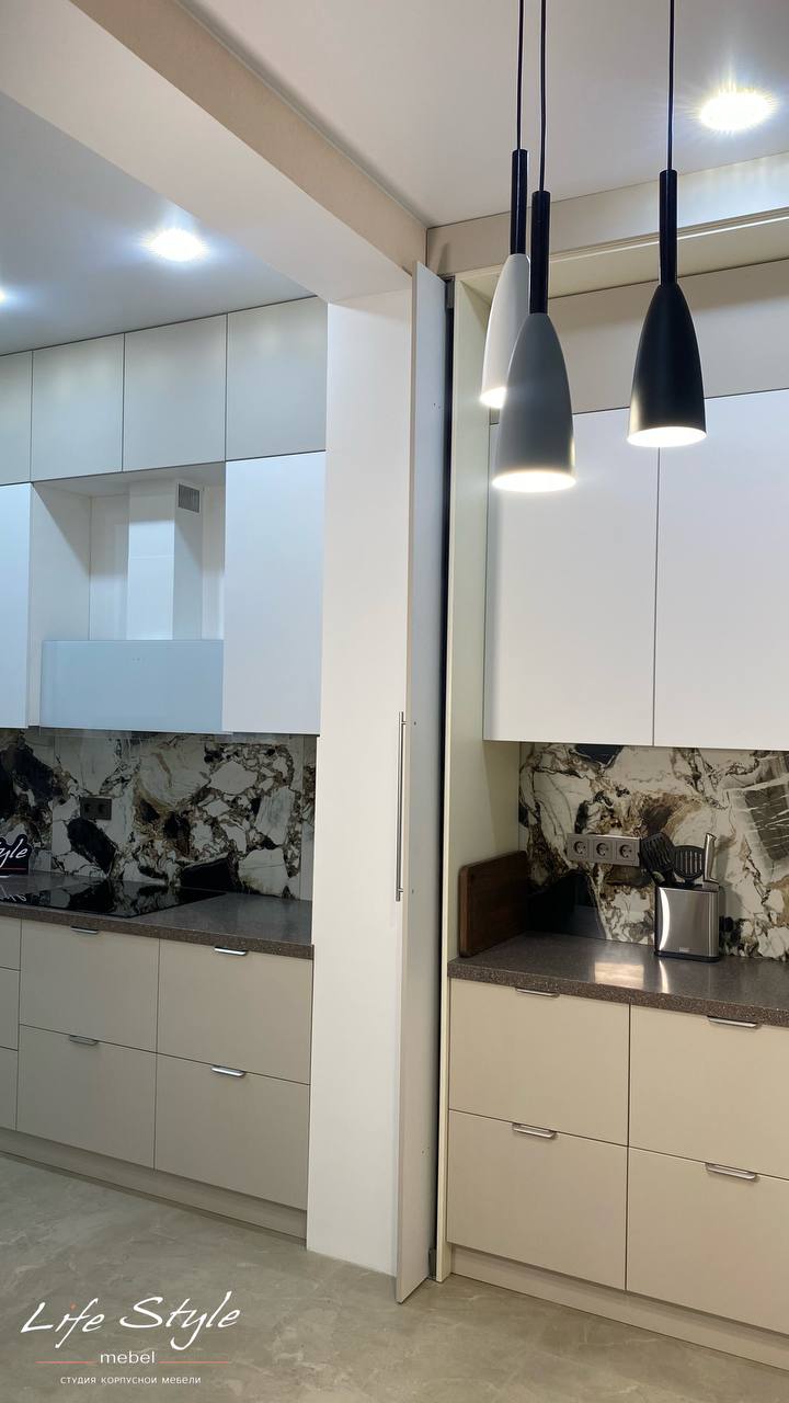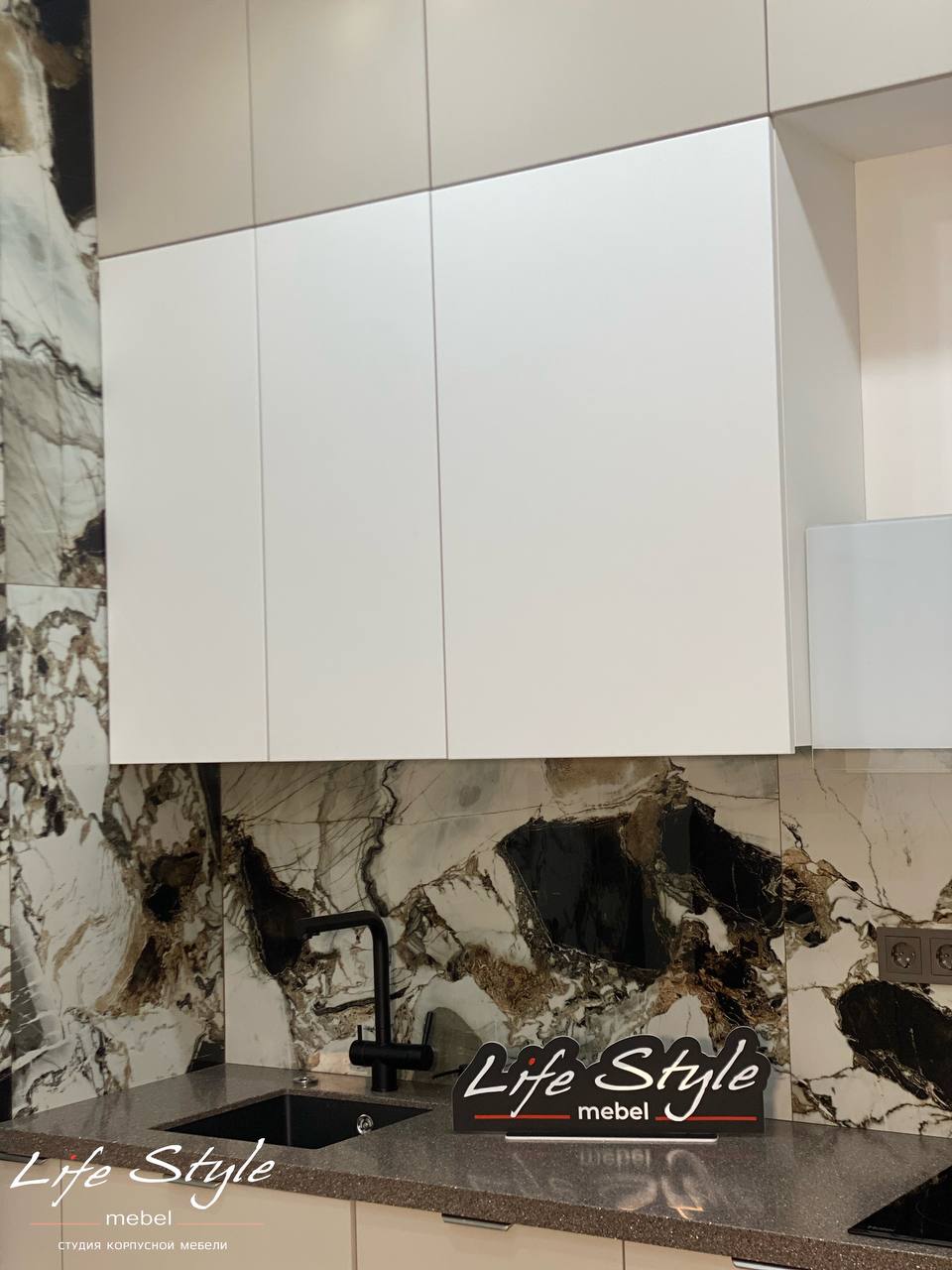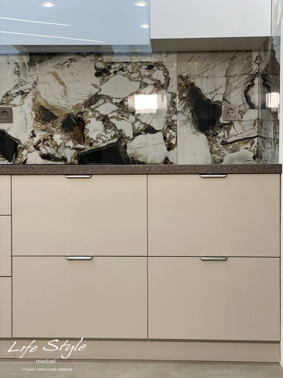Представляем вам кухонный гарнитур в белом и бежевом цвете с мраморной столешницей в коричневых тонах. Эта кухня является идеальным решением для тех, кто стремится к современному и элегантному интерьеру.