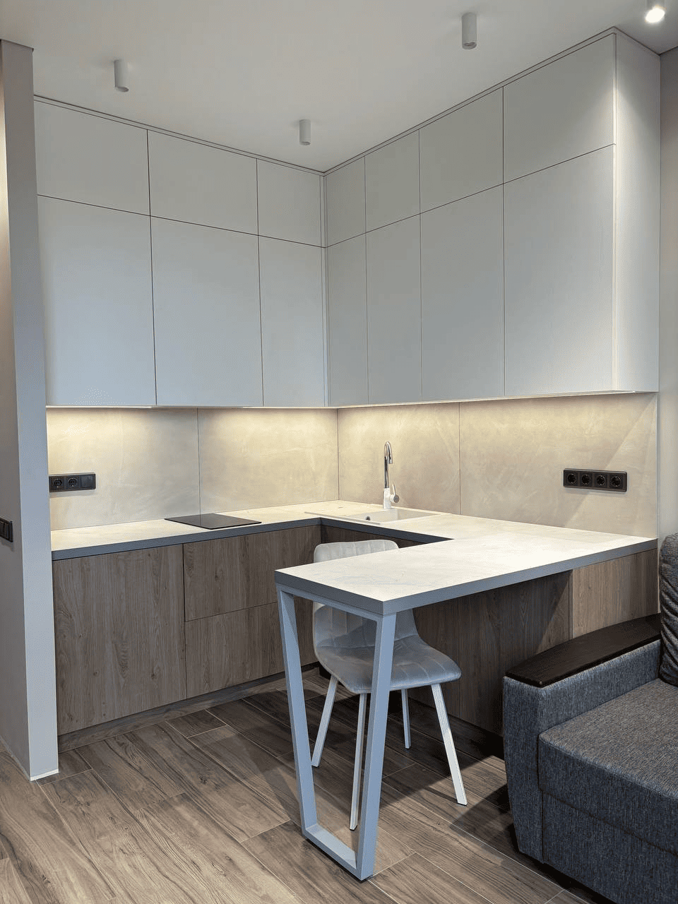 - Холодильник, морозильная камера и СВЧ аккуратно интегрированы, чтобы интерьер выглядел цельно и гармонично.