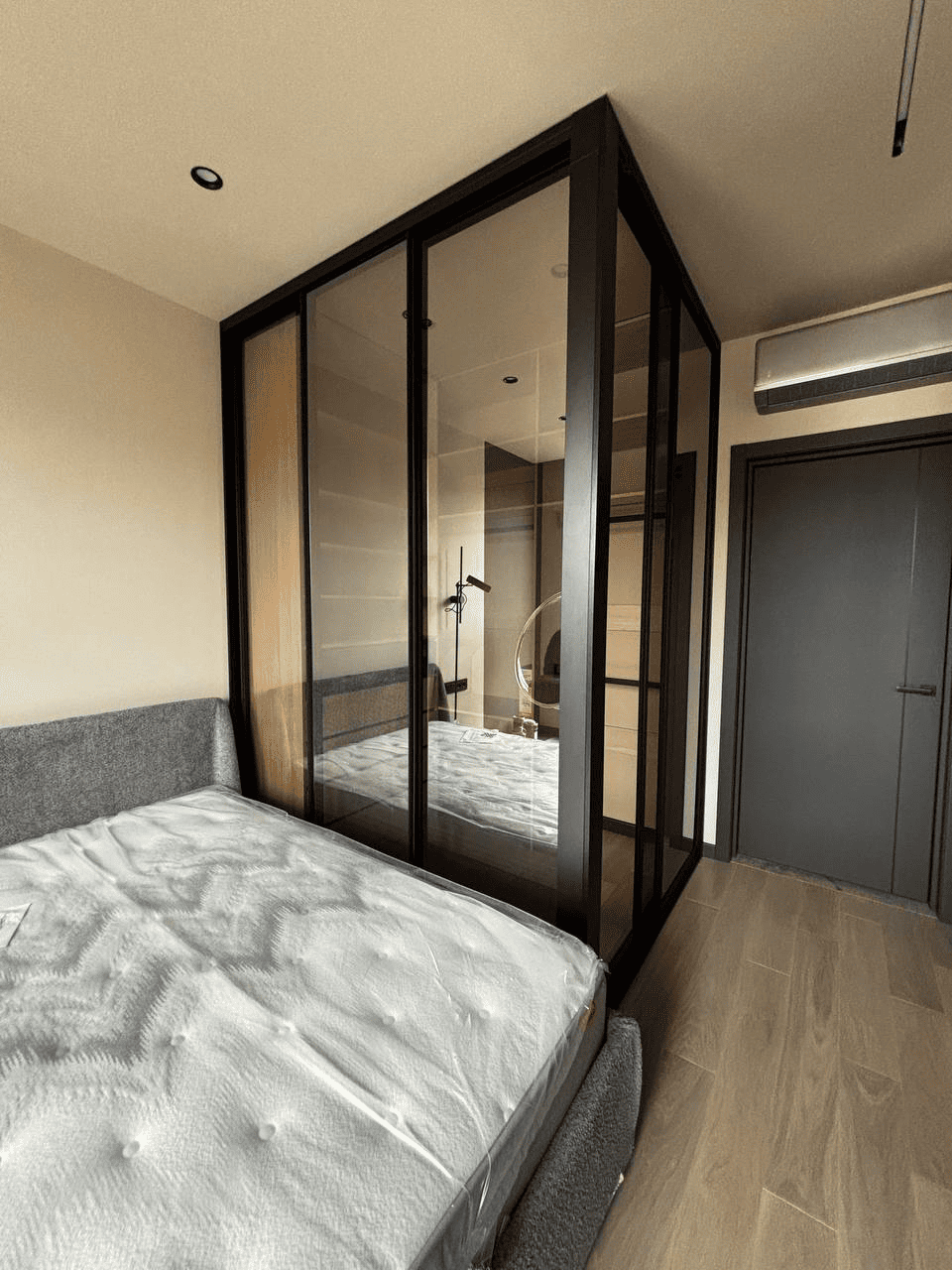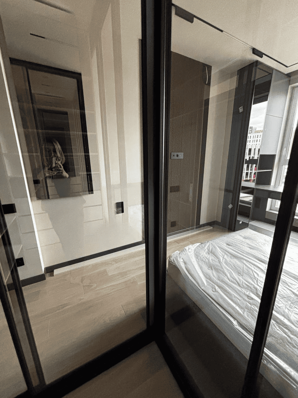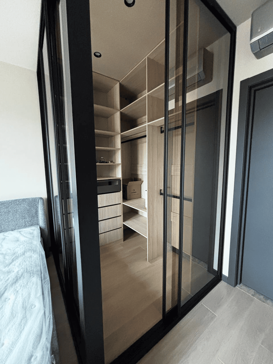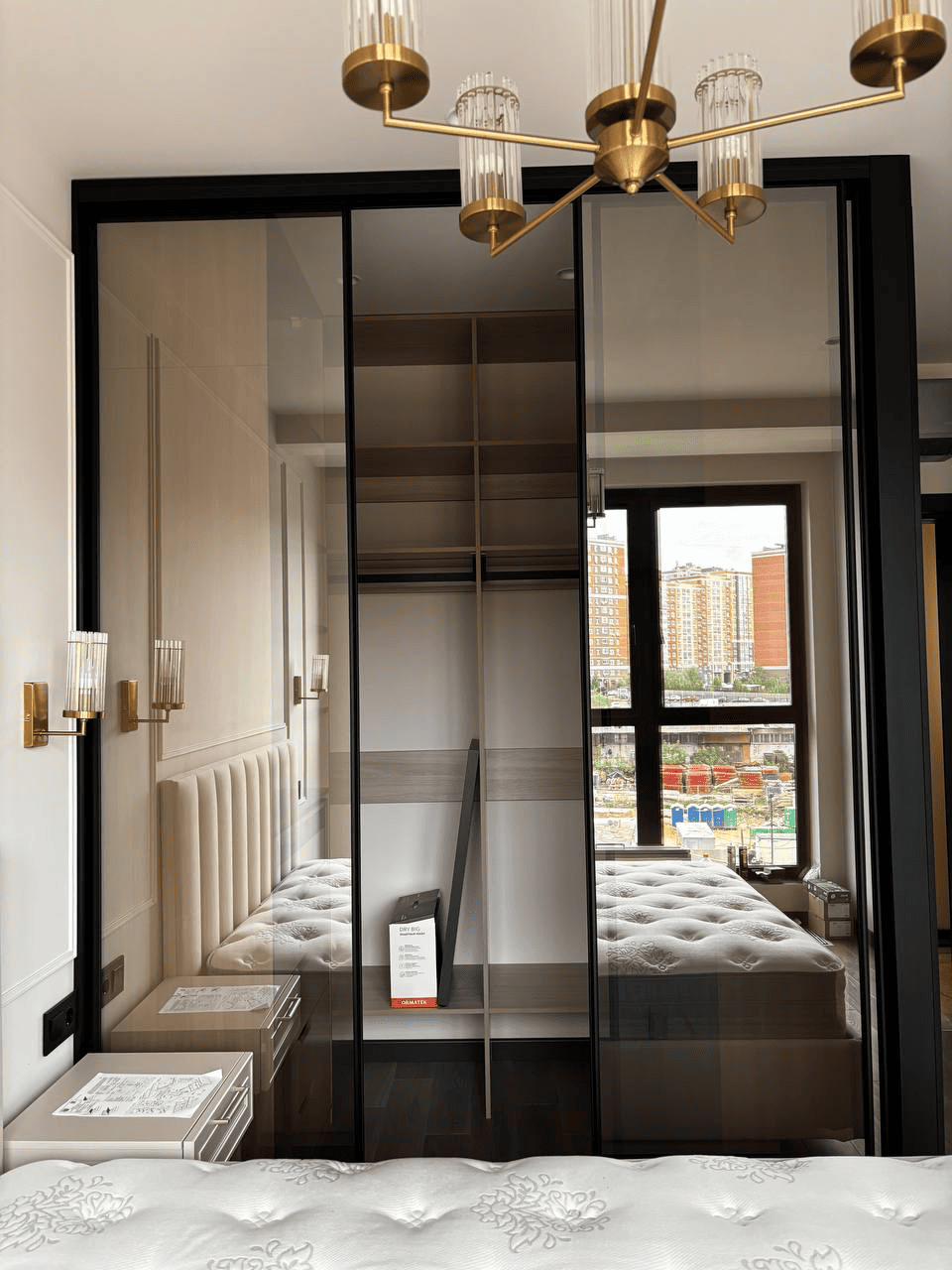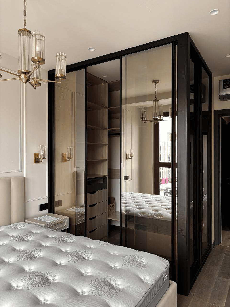 Стеклянные фасады визуально расширяют пространство, чёткая геометрия добавляет интерьеру статус, а продуманное наполнение делает хранение удобным и логичным! Такая гардеробная не утяжеляет интерьер, а наоборот — становится его стильным акцентом и функциональной частью спальни.