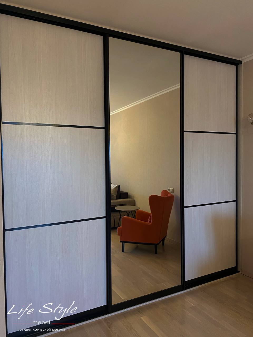 Одна из дверей шкафа выполнена из зеркала, что делает его еще более практичным и удобным. Зеркало помогает вам проверить свой образ перед выходом из дома, а также визуально расширяет пространство в комнате. Зеркальная поверхность отражает свет, что создает светлую и просторную атмосферу.
