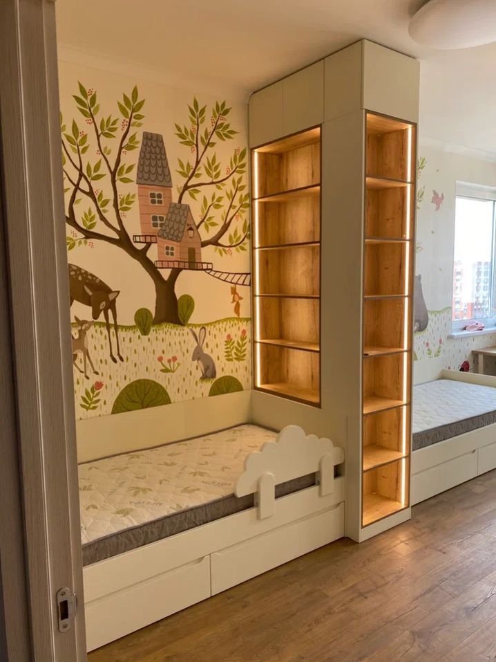 Есть уютные «гнёздышки» для вещей и игрушек: шкаф, стеллаж. Для учёбы – функциональный стол для двоих деток. Нежные цвета, эргономичный дизайн. Для комфорта и рационального использования площади. А ещё детская Сhildren's room – это бескрайнее поле для творчества и 1000 игр обеспечено! Можно воплотить любую тематическую задумку. И создать для малыша «свой мир», в котором он будет хозяином. Где он почувствует себя спокойно и расслабленно. Только представьте все улыбки, радости и шалости, трогательные эмоции. Подарите ребёнку безграничное счастье. С вашей любовью и детской мечты!